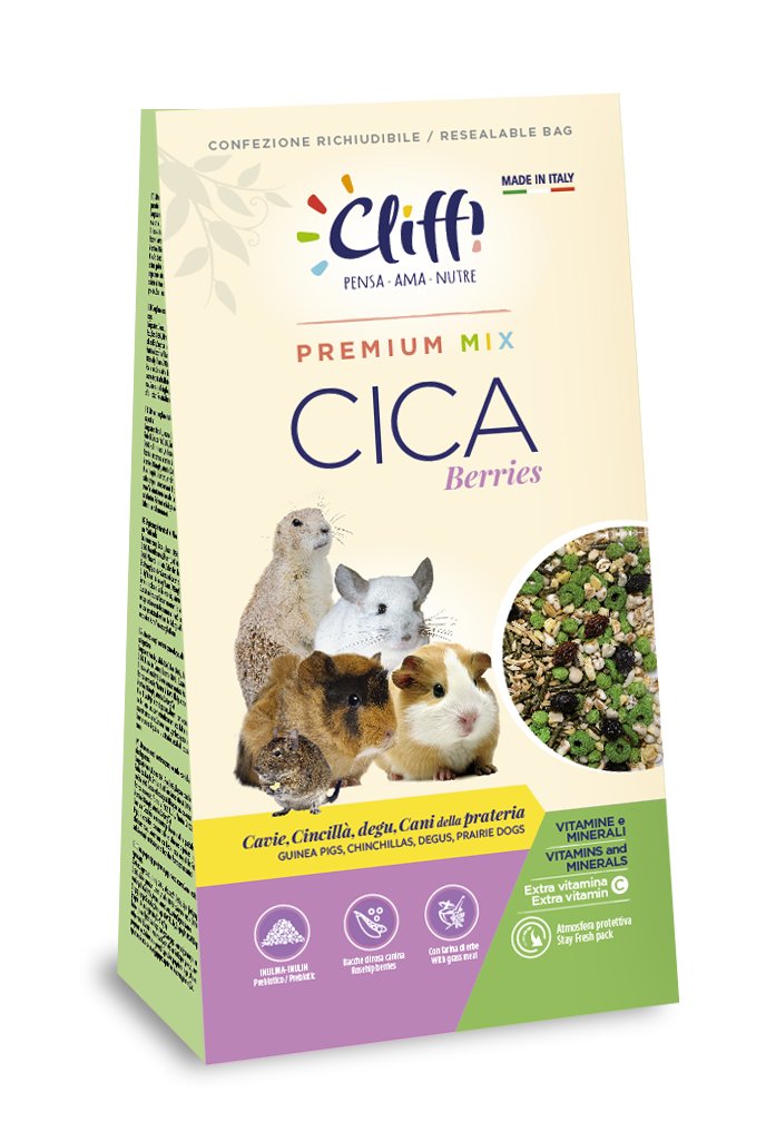 CICA BERRIES è ricco e appetitoso, per la felicità dei vostri piccoli amici. Apporta le sostanze che troverebbero in natura e che sono utili per una corretta ed equilibrata alimentazione e per il loro benessere, quali ERBE, ORTAGGI e BACCHE DI ROSA CANINA naturalmente ricche di vitamina C. Contiene Sali minerali e Vitamine, che aiutano a supportare il sistema immunitario e aiutano a limitare le carenze alimentari. Molto importante per le cavie è la presenza della vitamina C, perché non essendo sintetizzabile dal loro organismo deve essere apportata con l’alimentazione. Il prodotto è confezionato in atmosfera protettiva (sistema STAY FRESH PACK) che aiuta a preservare la qualità e la naturale freschezza del prodotto. SACCHETTO RICHIUDIBILE.
