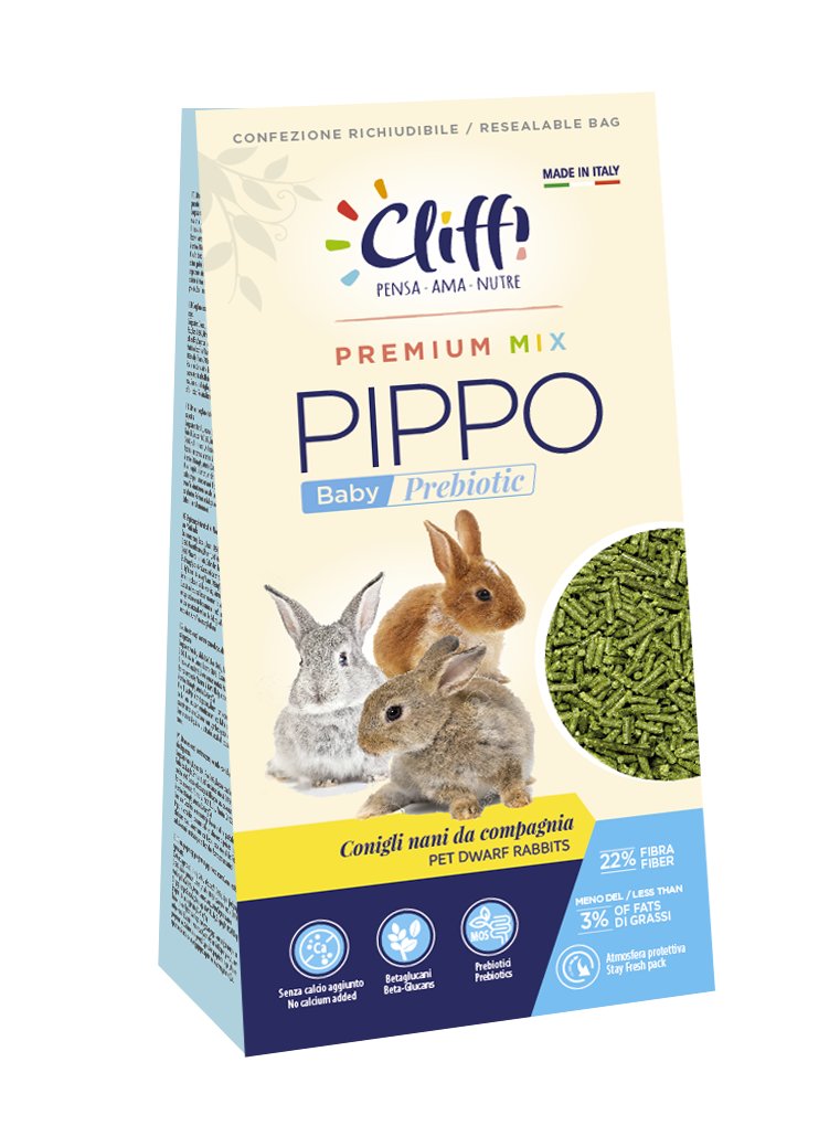 PIPPO BABY PREBIOTIC è studiato per soddisfare in modo fisiologico, le esigenze nutrizionali dei conigli nani giovani e adulti. I conigli sono animali erbivori e la loro alimentazione deve essere ricca in fibra e povera di grassi. PIPPO BABY PREBIOTIC risponde a queste esigenze perché è composto principalmente da varie erbe disidratate ed ha un alto contenuto in fibra. Contiene M.O.S (Mannanoligosaccaridi) che regolano la flora batterica intestinale, Betaglucani che contribuiscono a supportare un sistema immunitario sano ed ENERGY COMPLEX, un mix speciale, contenente Oligoelementi e Vitamine, che supporta il sistema immunitario e aiuta a limitare le carenze alimentari. PIPPO BABY PREBIOTIC è formulato senza semi e possiede un ottimale rapporto (5:1) fibra/amidi. Il prodotto è confezionato in atmosfera protettiva (sistema STAY FRESH PACK) che aiuta a preservare la qualità e la naturale freschezza del prodotto. SACCHETTO RICHIUDIBILE.